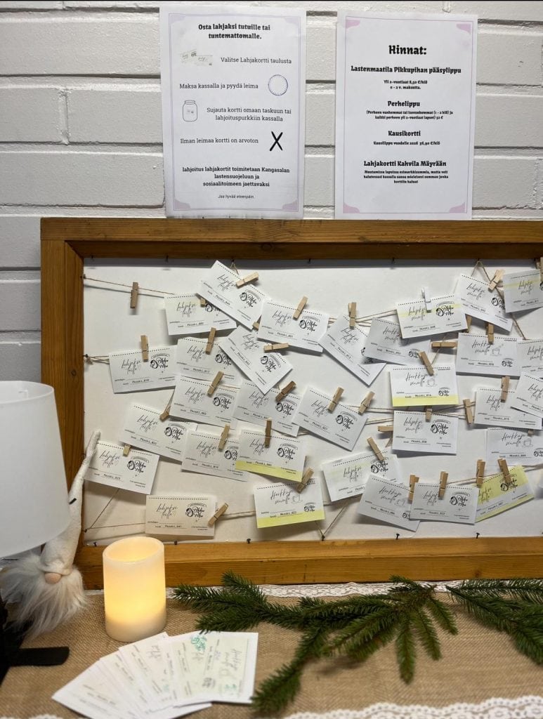 Lahjakortteja ostettiin sekä omiin pukinkontteihin että lahjoitettavaksi lastensuojeluun. Kyläosuuskunta halusi myös lahjoittaa lastensuojelun asiakkaille pääsylippuja Lastenmaatila Pikkupihalle. Näin saimme osaltamme olla antamassa joulumieltä perheille.